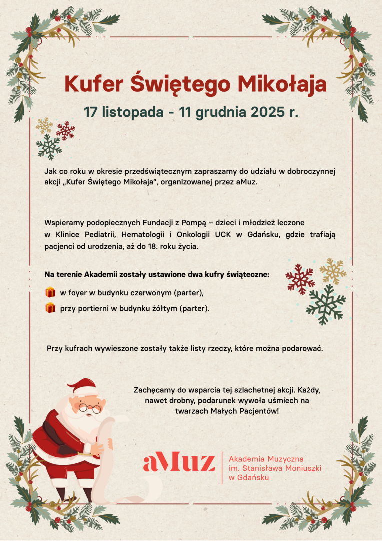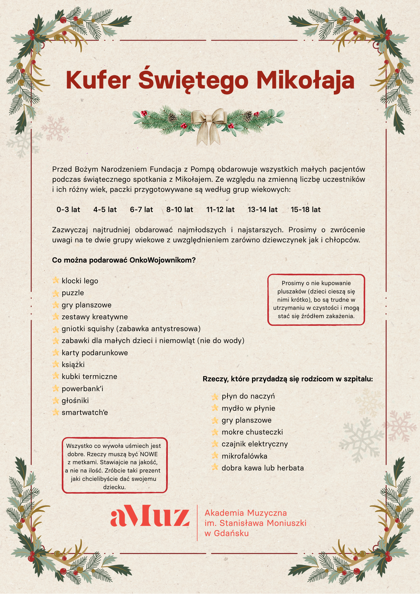 Wzorem lat ubiegłych organizujemy akcję charytatywną Kufer Świętego Mikołaja. W tym roku współpracujemy z Fundacją z Pompą. Wspieramy podopiecznych – dzieci i młodzież leczone w Klinice Pediatrii, Hematologii i Onkologii UCK w Gdańsku, gdzie trafiają pacjenci od urodzenia, aż do 18. roku życia. W procesie leczenia, niezwykle ważna jest obecność i wsparcie Rodziców. Ich także można wesprzeć.