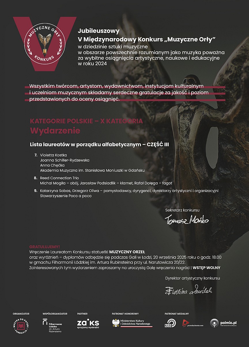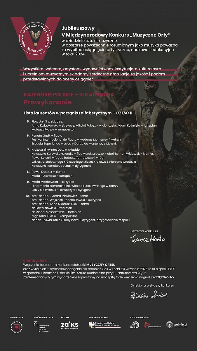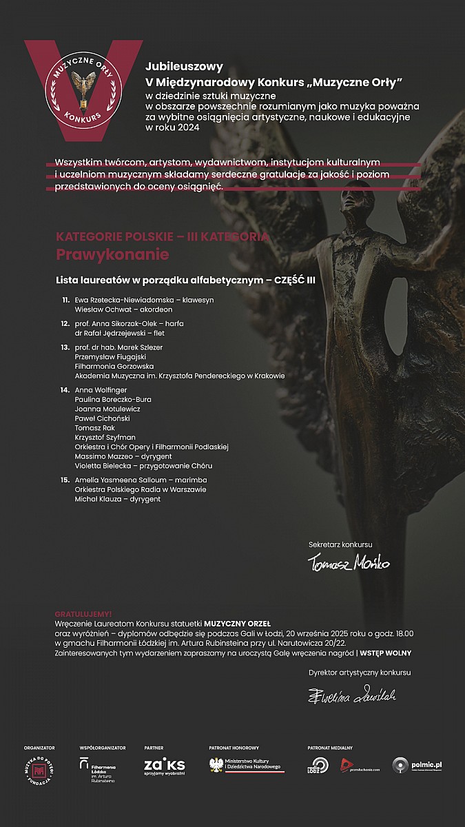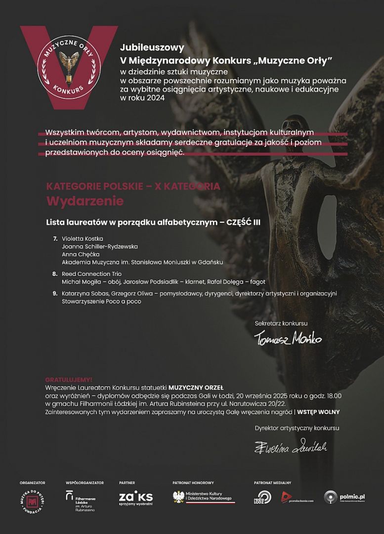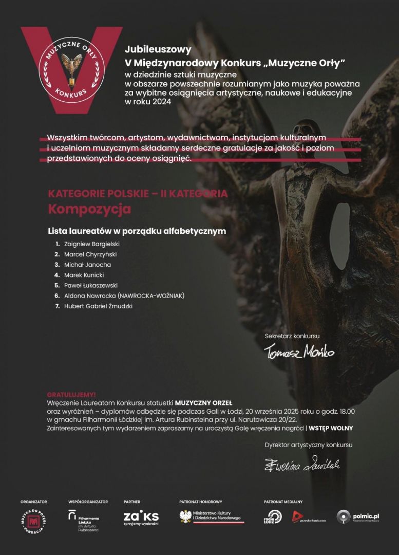 w dniu 7 września 2025 r. członkowie Kapituły V edycji prestiżowego Międzynarodowego Konkursu „MUZYCZNE ORŁY” w składzie: