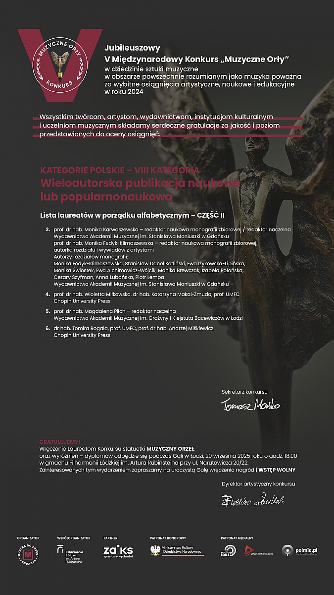 prof. dr hab. Monika Fedyk-Klimaszewska, prof. dr hab. Stanisław Daniel Kotliński, prof. dr hab. Ewa Iżykowska-Lipińska, Monika Świostek, Ewa Alchimowicz-Wójcik, Monika Brewczak, Izabela Połońska, Cezary Szyfman, Anna Lubańska, dr Piotr Lempa, Katarzyna Hołysz, prof. dr hab. Leszek Skrla - Wydawnictwo Akademii Muzycznej im. Stanisława Moniuszki w Gdańsku