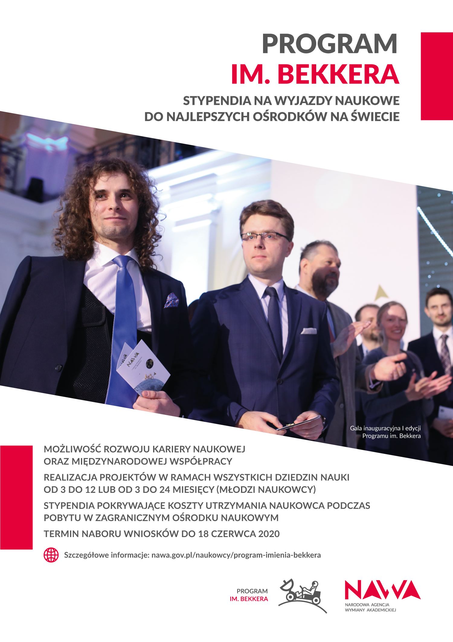 Program Stypendialny im. Mieczysława Bekkera Narodowej Agencji Wymiany Akademickiej wspiera naukowców i nauczycieli akademickich zatrudnionych w polskich uczelniach oraz jednostkach naukowych w dążeniu do doskonałości naukowej poprzez umożliwienie im odbycia stażu podoktorskiego, prowadzenia badań naukowych lub pozyskania materiałów do pracy naukowej w renomowanych ośrodkach zagranicznych na zasadach stypendialnych. Program jest otwarty dla naukowców reprezentujących wszystkie dziedziny nauki, a jednostkami goszczącymi mogą być ośrodki naukowe lub akademickie na całym świecie. Nabór wniosków jest prowadzony do 18 czerwca 2020 roku.