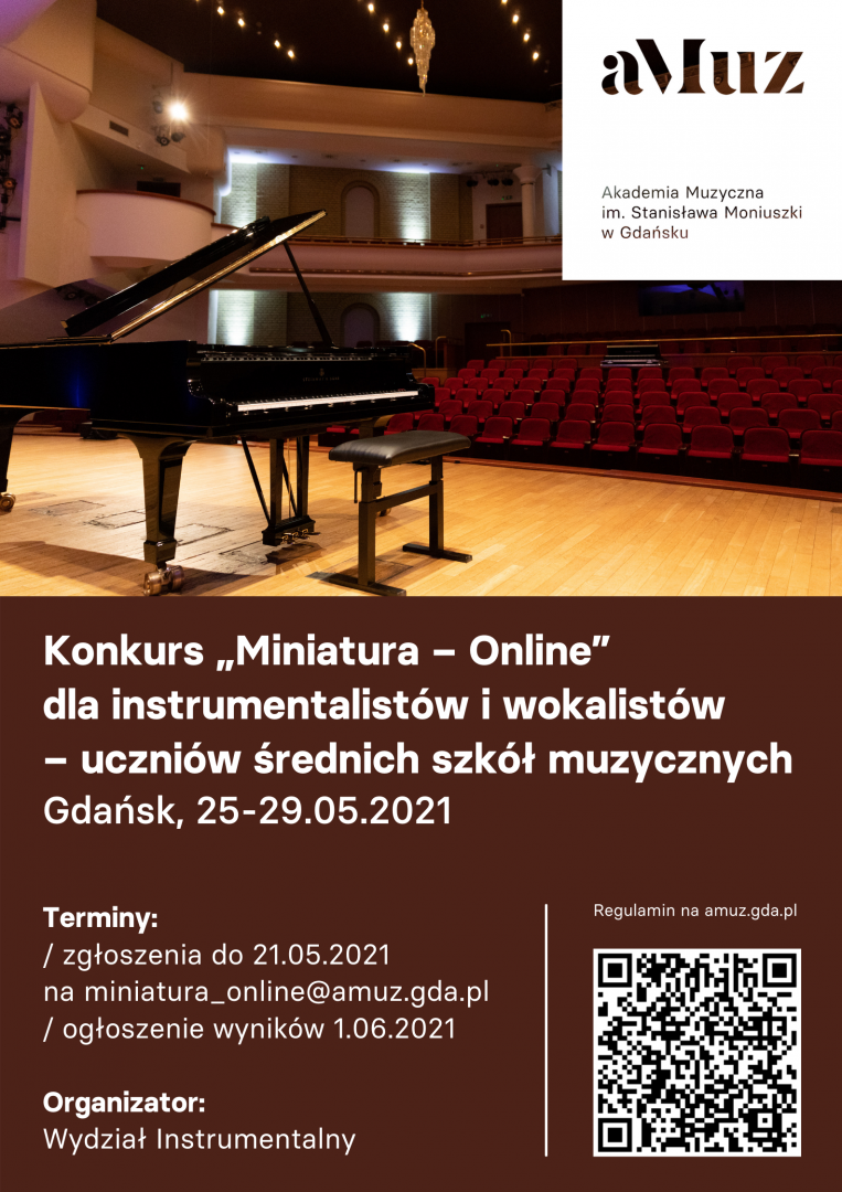 informujemy, że w dniach 25-29 maja 2021 r. odbędzie się Ogólnopolski Konkurs „Miniatura – Online” dla młodzieży, którego organizatorem jest Akademia Muzyczna im. Stanisława Moniuszki w Gdańsku.