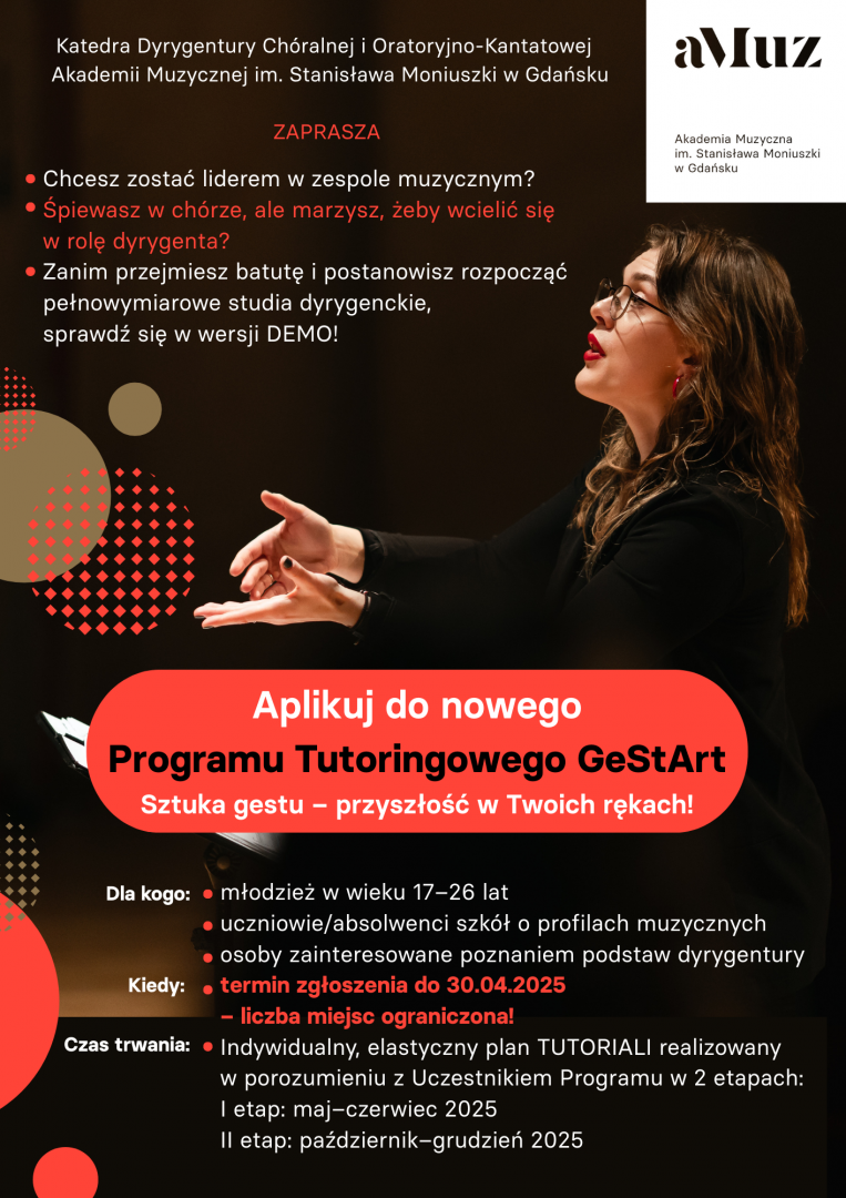 Aplikuj do nowego Programu Tutoringowego GeStArt Sztuka gestu – przyszłość w Twoich rękach!, do którego zaprasza Cię Katedra Dyrygentury Chóralnej i Oratoryjno-Kantatowej aMuz!