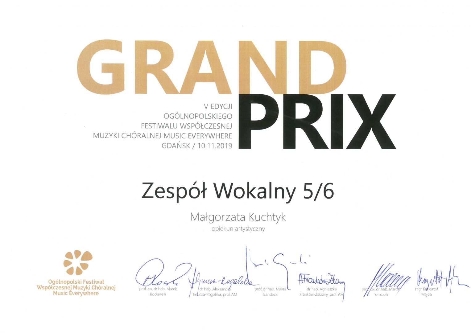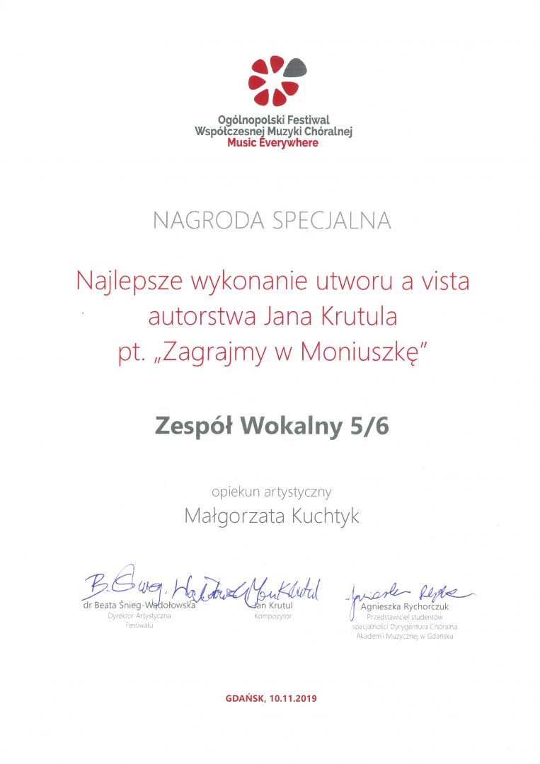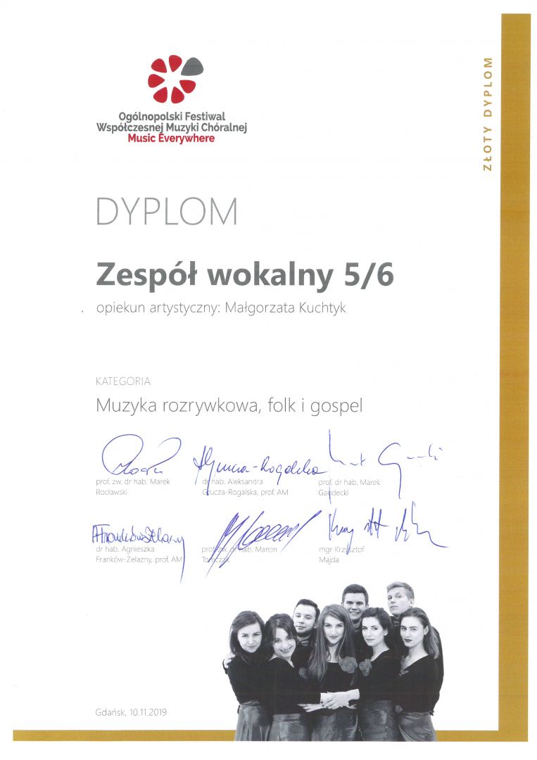 Zespół wokalny 5/6 w składzie: Justyna CZARNOTA, Małgorzata OLESZCZUK, Renata TUSZYŃSKA, Irena ZAPOLSKA, Paweł ORŁOWSKI i Wiktor GABOR (I rok studiów II st., specjalność wokalistyka jazzowa), którego opiekunem artystycznym jest dr hab. Małgorzata Kuchtyk, zdobył GRAND PRIX (puchar Rektora Akademii Muzycznej w Gdańsku) i 5 000 PLN, ZŁOTY DYPLOM w kategorii chórów rozrywkowych (100 pkt.) oraz NAGRODĘ SPECJALNĄ za najlepsze wykonanie utworu a vista na V Ogólnopolskim Festiwalu Współczesnej Muzyki Chóralnej „Music Everywhere” w Gdańsku (9-10.11.2019).