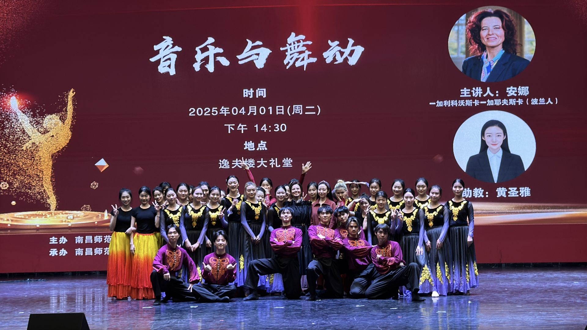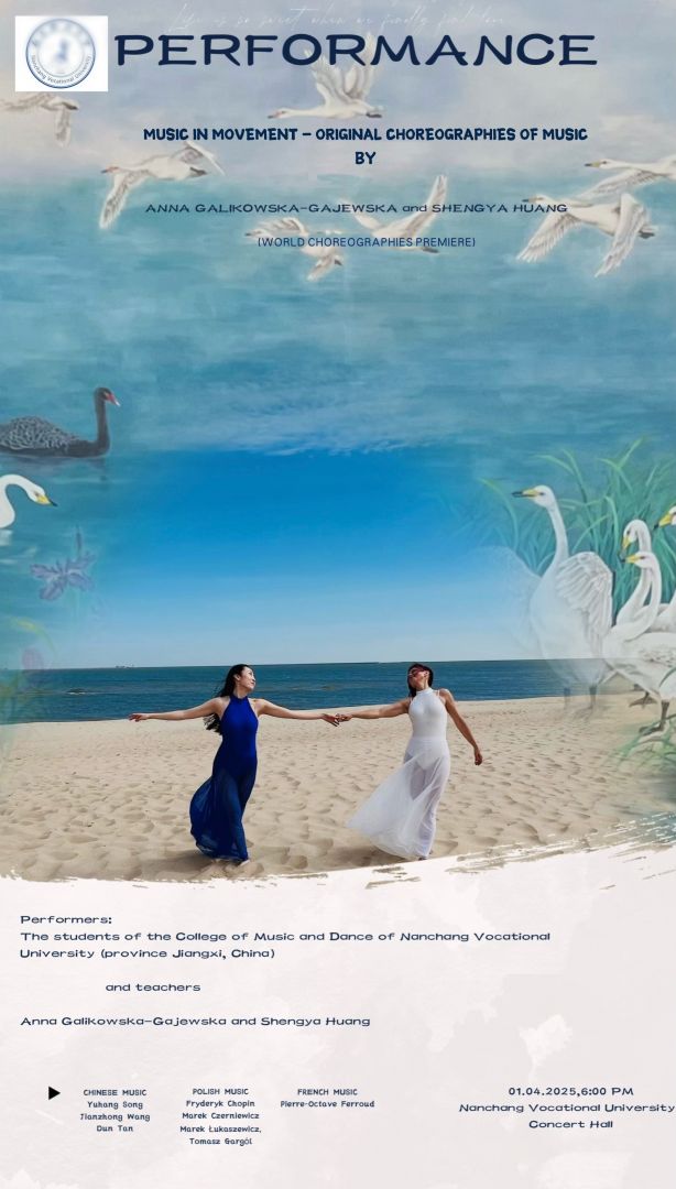 Prof. dr hab. Anna Galikowska-Gajewska oraz mgr Shengya Huang (uczestniczka stażu artystycznego – Wokół metody Rytmiki) zaprezentowały swoje prace artystyczne na dwóch koncertach, które odbyły się 1 kwietnia 2025 r. w salach koncertowych Nanchang Normal University oraz Nanchang Vocational University (w Nanchang – stolicy prowincji Jianxi). Po raz pierwszy chińska publiczność miała okazję zobaczyć autorską choreografię muzyki Anny Galikowskiej-Gajewskiej do Poloneza As-dur op. 53, zwany „heroiczny” – Fryderyka Chopina, w której wzięło udział 30 wykonawców oraz autorską choreografię Shengyi Huang, powstałą do utworu Marka Łukaszewicza i Tomasza Gargóla – Amare è sognare, z udziałem 16 wykonawców (były to światowe premiery). Wśród repertuaru znalazła się również multimedialna choreografia utworu Marka Czerniewicza – temat z filmu „Nakręceni” – wielokrotnie prezentowana już w przestrzeni międzynarodowej, w Chinach po raz pierwszy. Autorka choreografii – Anna Galikowska-Gajewska, wykonawcy: Anna Galikowska-Gajewska i Shengya Huang, multimedia – Paweł Wajde. Wykonawcami koncertu byli studenci kierunku taniec the College of Music and Dance of Nanchang Vocational University. Koncerty poprowadziły autorki choreografii.