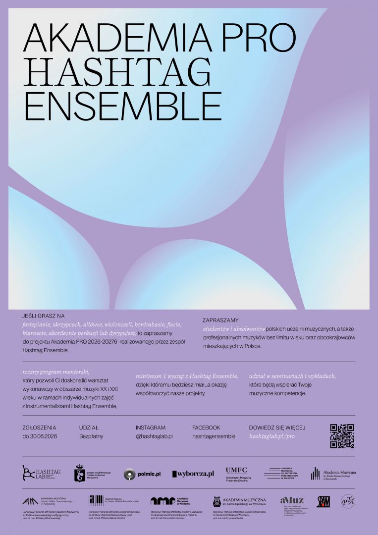 Serdecznie zapraszamy do udziału w projekcie Akademia PRO 2026-2027 realizowanym przez zespół Hashtag Ensemble. Projekt swoim honorowym patronatem objął JM Rektor Akademii Muzycznej im. Stanisława Moniuszki w Gdańsku prof. dr hab. Ryszard Minkiewicz.