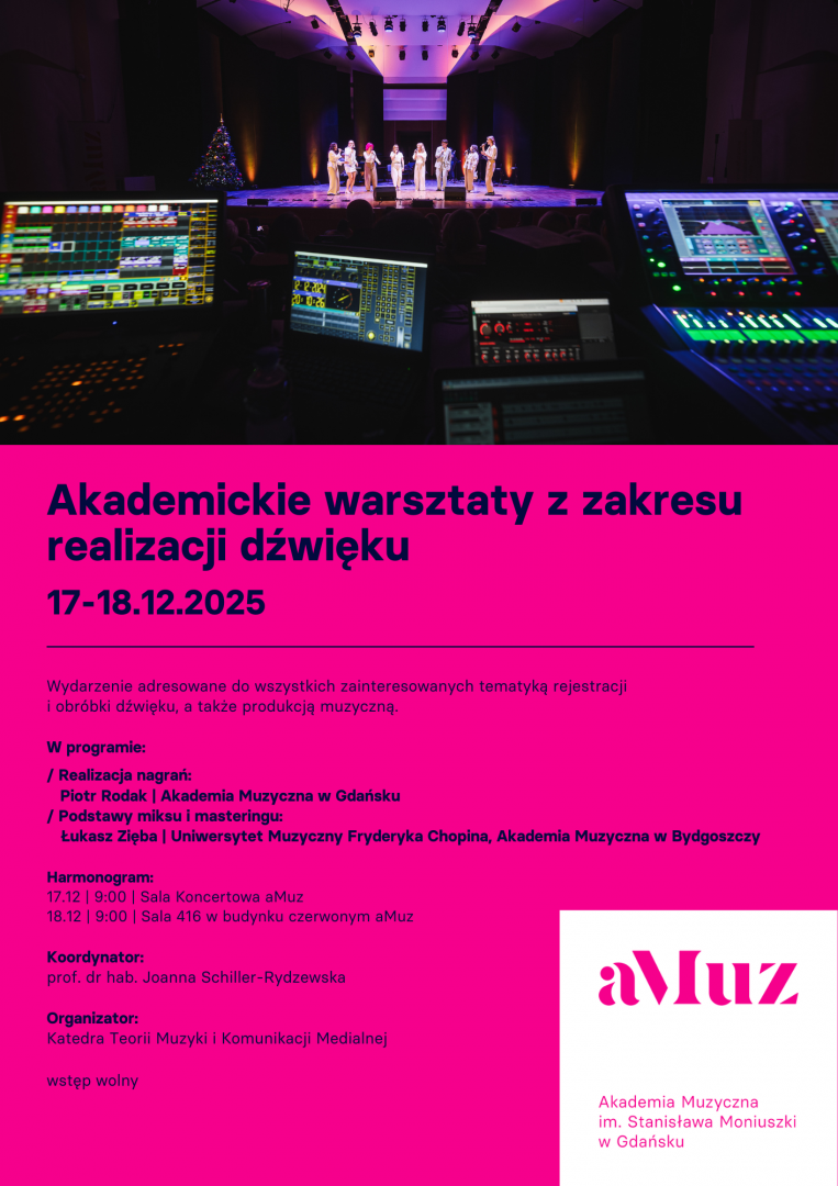 Warsztaty z realizacji dźwięku to dwudniowe wydarzenie adresowane do wszystkich zainteresowanych tematyką rejestracji i obróbki dźwięku, a także produkcją muzyczną. Na warsztaty złożą się dwa komponenty:
