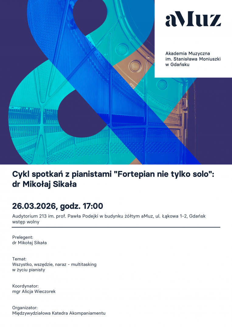 Tym razem naszym prelegentem będzie dr Mikołaj Sikała, pianista, absolwent Akademii Muzycznej im. Stanisława Moniuszki w Gdańsku, z klasy dra Kordiana Góry (studia licencjackie oraz magisterskie) oraz dr hab. Elżbiety Pasierowskiej (studia doktoranckie), wielokrotnie nagradzany podczas prestiżowych konkursów za grę solową i kameralną, któremu nieobce są również meandry sztuki kompozycji.