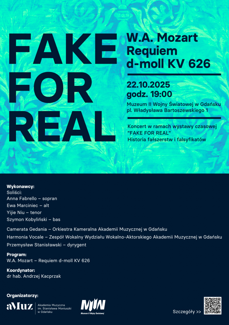 Ekspozycja Fake for Real. Historia fałszerstw i falsyfikatów, przygotowana przez Dom Historii Europejskiej w Brukseli, poświęcona zjawisku fałszerstwa w historii Europy – od starożytności po czasy współczesne – staje się intrygującym tłem również dla Requiem. Historia tego utworu pełna jest niedopowiedzeń, mitów i legend: czy to naprawdę dzieło Mozarta? A może Süssmayra? A może – obu? A może jeszcze innych uczniów Mozarta? Właśnie te pytania nadają jego wykonaniu niepokojącą aktualność – w świecie, który wciąż na nowo pyta o autentyczność, prawdę i źródła. Requiem Mozarta w wersji ukończonej przez Franza Xavera Süssmayra nie jest falsyfikatem w ścisłym tego słowa znaczeniu. Ale jest dziełem częściowo mistyfikowanym historycznie, które przez dziesięciolecia funkcjonowało w kulturze jako dzieło jednego autora, mimo że powstało w wyniku współpracy, redakcji i rekonstrukcji pośmiertnej kilku kompozytorów.