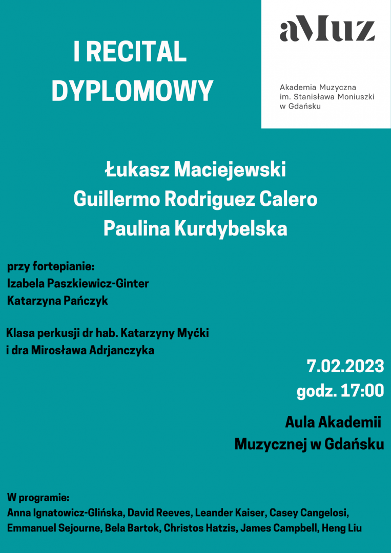 Plakat wydarzenia I recital dyplomowy Łukasza Maciejewskiego, Guillerma Rodrigueza Calero, Pauliny Kurdybelskiej – perkusja (studia II st.)