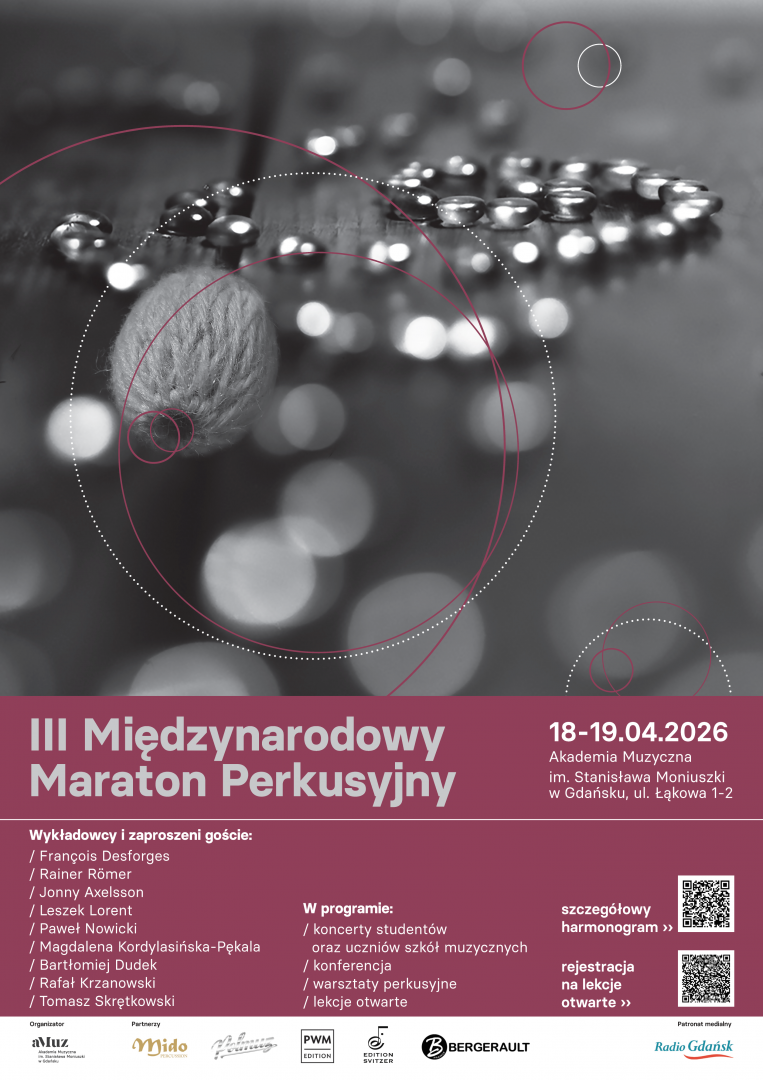 The 3rd International Percussion Marathon in Gdańsk is an event of a distinctly international character, aimed at integrating the percussion community and creating a space for the exchange of experiences among artists, educators, and young percussionists. The Marathon consistently fulfills its educational mission by bringing together diverse traditions, aesthetics, and generations of performers.