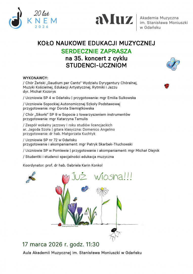 Już wiosna! to 35. koncert edukacyjny z cyklu Studenci-uczniom przygotowany z myślą o uczniach klas IV–VIII szkół podstawowych województwa pomorskiego. Wiosna – czas odradzania się przyrody, świeżości i nowych początków – staje się inspiracją do muzycznych spotkań pełnych barw, energii i emocji. W programie koncertu znajdą się utwory kaszubskie, a także kompozycje wprowadzające w wiosenny nastrój. Nie zabraknie również elementów interaktywnych i wspólnego śpiewu. Studenci oraz absolwenci edukacji muzycznej podzielą się z dziećmi muzyczną pasją i zainspirują do rozwijania wrażliwości artystycznej. Na scenie pojawią się również dzieci, które swoimi występami chcą włączyć się w powitanie tej pięknej pory roku. Koncert wpisuje się w obchodzony w tym roku jubileusz 20-lecia Koła Naukowego Edukacji Muzycznej Akademii Muzycznej w Gdańsku.