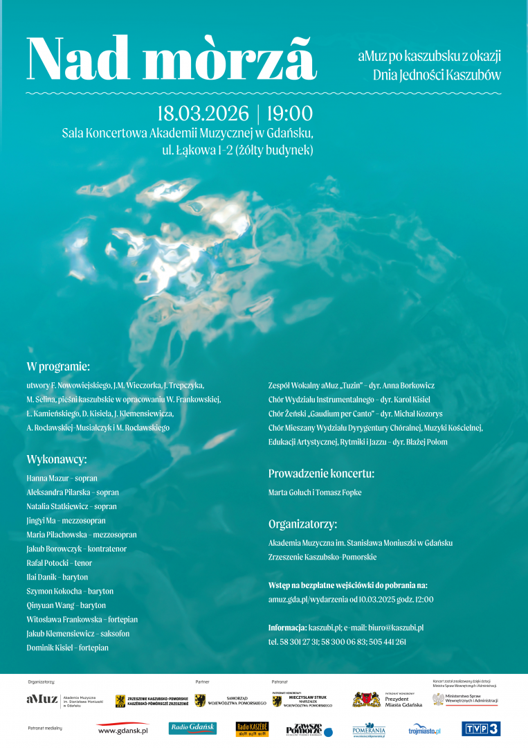 Koncert aMuz po kaszubsku to wyjątkowe wydarzenie artystyczne, w którym studenci, doktoranci i pedagodzy Wydziału III – Wokalno-Aktorskiego oraz Wydziału IV – Dyrygentury Chóralnej, Muzyki Kościelnej, Edukacji Artystycznej, Rytmiki i Jazzu sięgają do bogactwa kaszubskiej kultury muzycznej. W programie znajdą się pieśni tradycyjne, utwory inspirowane folklorem regionu oraz współczesne interpretacje tekstów i melodii kaszubskich, opracowane z wrażliwością wokalną i sceniczną. To artystyczny hołd złożony dziedzictwu Pomorza, łączący język kaszubski, jego brzmienie i symbolikę z klasycznym warsztatem wykonawczym. Koncert stanowi również wyraz uznania dla różnorodności kulturowej regionu i jej żywej obecności w przestrzeni akademickiej.
