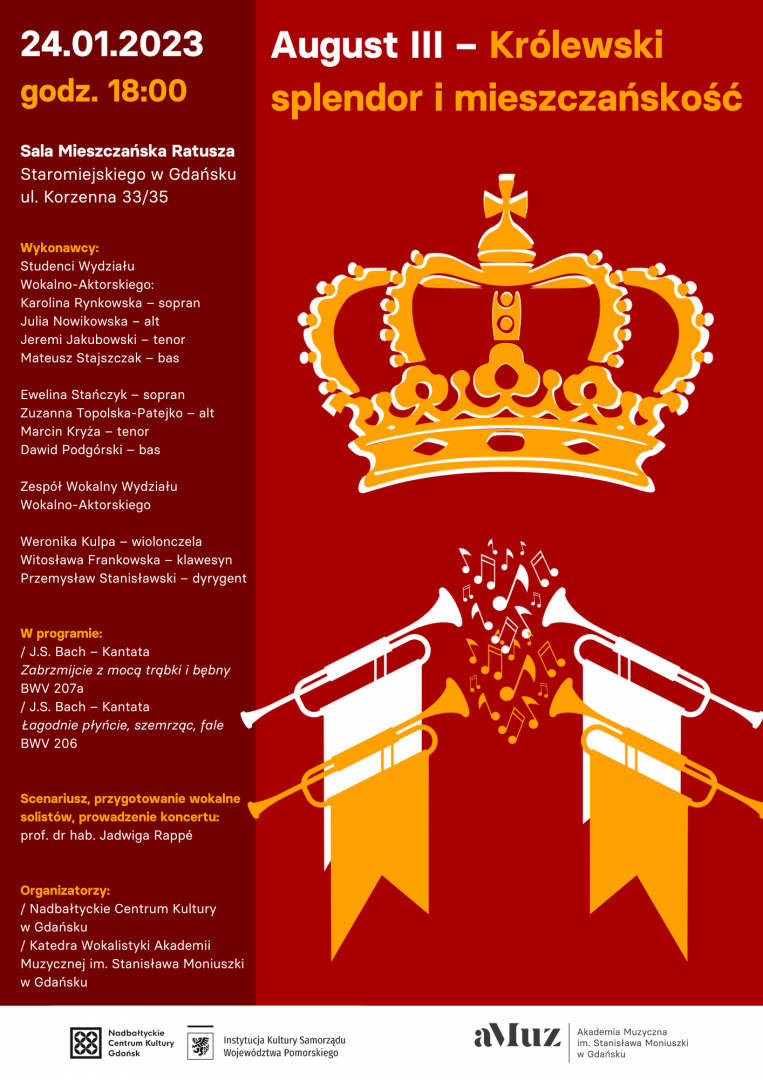 W programie koncertu August III – Królewski splendor i mieszczańskość usłyszymy dwie niesłychanie rzadko wykonywane kantaty Johanna Sebastiana Bacha. Obie kompozycje poświęcone są postaci Augusta III, który po zgonie Augusta II Mocnego objął panowanie w Polsce. Podobnie, jak Wielka Msza h-moll, powstały z nadzieją na uzyskanie przez Bacha konkretnych korzyści, wynikających z ewentualnej królewskiej protekcji. Obie, dzięki librettu autorstwu prawdopodobnie Picandera, umocowane w realiach politycznych i społecznych sprzed blisko 300 lat rzucają niesamowite światło na sposób traktowania władzy królewskiej przez jego poddanego, genialnego J.S. Bacha.