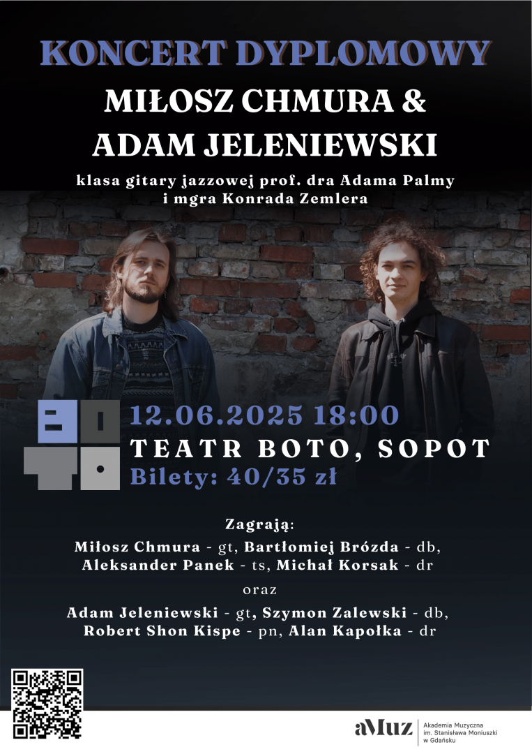 Plakat wydarzenia Koncert dyplomowy Miłosza Chmury (studia I st.) i Adama Jeleniewskiego (studia II st.) - gitara jazzowa