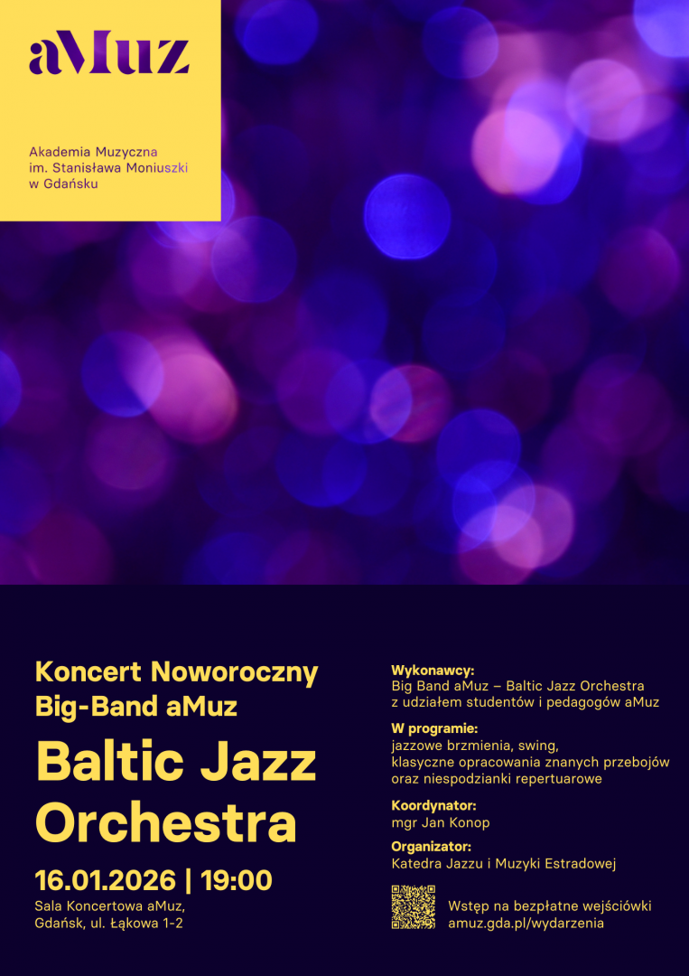 Z okazji rozpoczęcia nowego roku artystycznego i kalendarzowego Akademia Muzyczna w Gdańsku zaprasza na wyjątkowy wieczór muzyczny inaugurujący rok 2026. W programie znajdą się jazzowe brzmienia, swing, klasyczne opracowania znanych przebojów oraz niespodzianki repertuarowe w wykonaniu Baltic Jazz Orchestra, z udziałem studentów i pedagogów aMuz. Będzie to koncert pełen energii, ekspresji, blasku i radości – muzyczny toast za pomyślność, inspirację i dobre brzmienia w Nowym Roku.