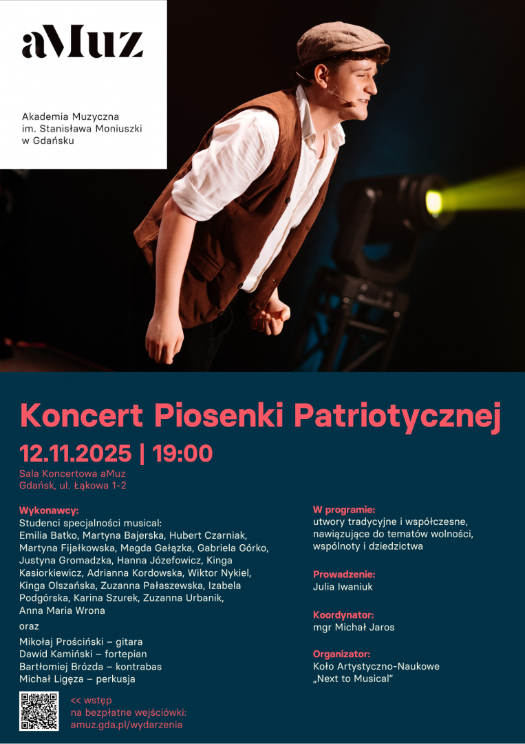 Koło Artystyczno-Naukowe „Next to Musical”, działające przy Katedrze Musicalu Wydziału III Wokalno-Aktorskiego Akademii Muzycznej w Gdańsku, zaprasza na Koncert Piosenki Patriotycznej – wydarzenie, w którym młodzi wykonawcy poprzez muzykę oddają hołd historii, pamięci i tożsamości narodowej. W programie koncertu znajdą się utwory zarówno tradycyjne, jak i współczesne, nawiązujące do tematów wolności, wspólnoty i dziedzictwa. Aranżacje przygotowane w stylistyce musicalowo-estradowej ukazują różnorodne emocje i formy ekspresji – od liryki po energię wspólnego śpiewu. Pieśni patriotyczne, znane z dziejów narodowej kultury, zabrzmią w nowych, zaskakujących interpretacjach, niosąc ze sobą wzruszenie, siłę i świeże spojrzenie młodego pokolenia. Wokalistom towarzyszyć będą instrumentaliści z Wydziałów II i IV aMuz. Wspólnie stworzą wieczór pełen muzycznej refleksji, który poruszy niejedno serce.