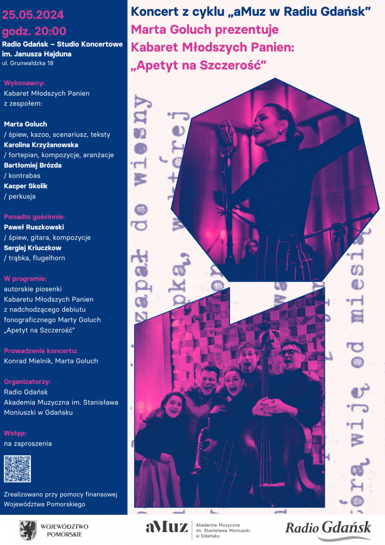 „Apetyt na Szczerość” to spektakl muzyczny Kabaretu Młodszych Panien, który powstał z inicjatywy wokalistki i autorki tekstów Marty Goluch na kanwie jej spółki autorskiej wespół w zespół z kompozytorką Karoliną Krzyżanowską. Młodsze Panny Dwie połączyli oczywiście Starsi Panowie Dwaj i tak przez ostatni rok pod wezwaniem (nie)Świętych Przybory i Wasowskiego spod piór i klawiszy dwóch studentek Jazzu i muzyki estradowej wyszło około tuzin piosnek, które staną się punktem odniesienia dla szczerych monologów Panny M. Autorka wygłosi je w ulubionym miesiącu spod znaku kwitnącego bzu, wokół pewnej osobistej majowej rocznicy, w przestrzeni, w której zawsze żołądek i serce domagają się Szczerości. W ciemni studia radiowego, twarzą w twarz z mikrofonem niby podczas swojej autorskiej audycji opowie i wyśpiewa z siebie „rymowane reportaże” z ulic swoich miast, mieszkań znajomych i nieznanych nikomu, z wyidealizowanych portretów miłostek, kwaśnych mrzonek, z oczarowań-rozczarowań i miłości. Też.