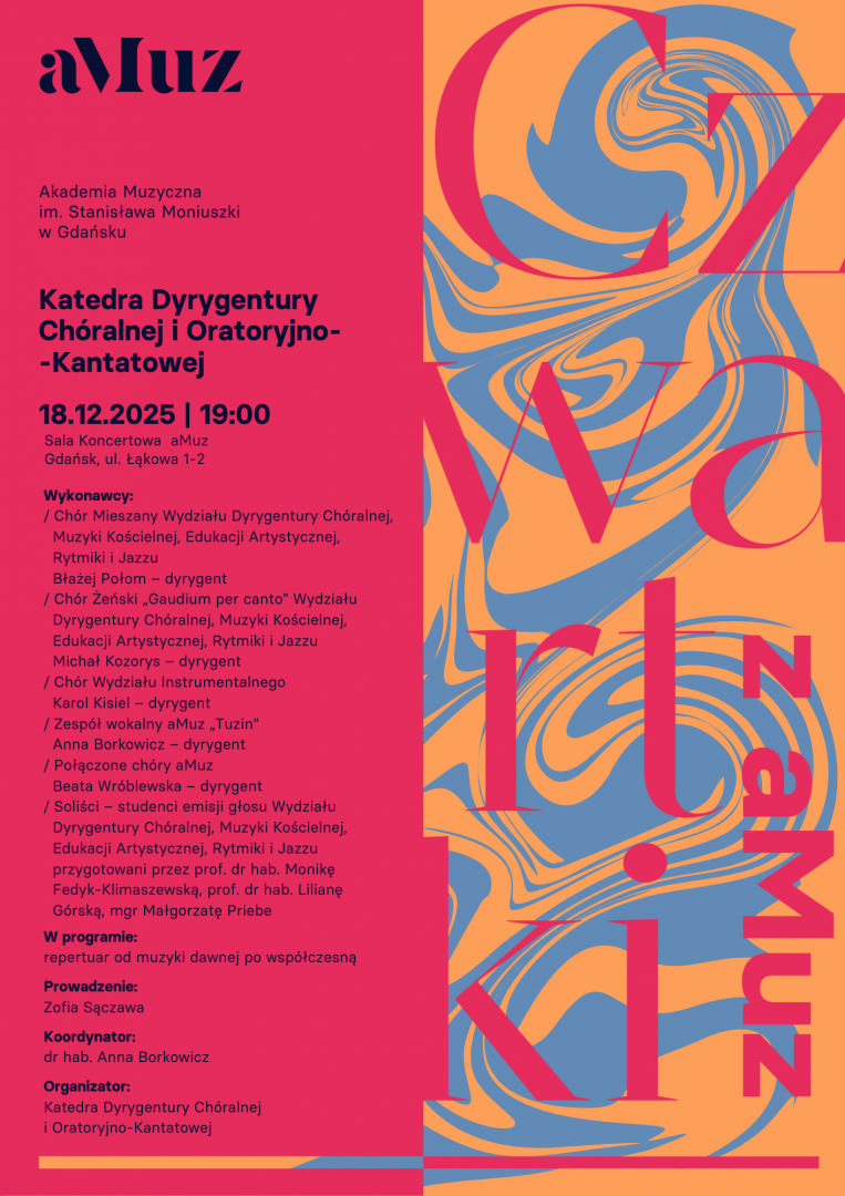 Zapraszamy na koncert prezentujący działalność artystyczną i pedagogiczną Katedry Dyrygentury Chóralnej i Oratoryjno-Kantatowej. Wystąpią chóry prowadzone przez studentów oraz pedagogów, wykonując zróżnicowany repertuar – od muzyki dawnej po współczesną. Wydarzenie stanowi wyraz wspólnej pasji do dyrygowania, pracy zespołowej i muzyki chóralnej, rozumianej jako przestrzeń artystycznego dialogu i współtworzenia.
