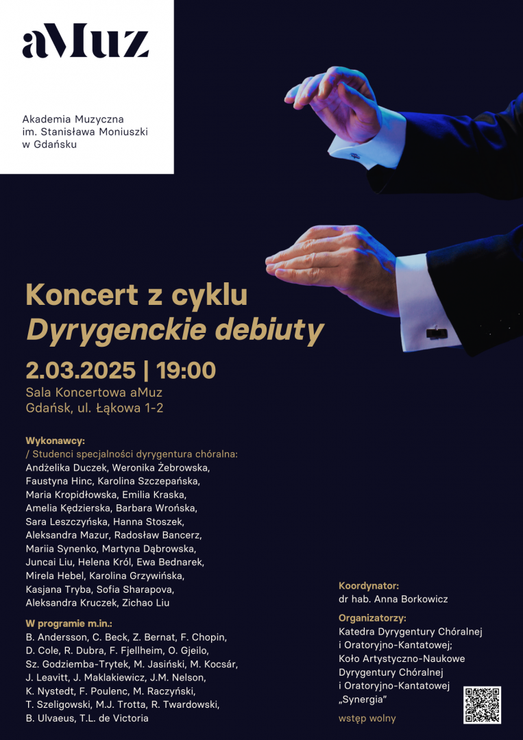 Studenci specjalności „dyrygentura chóralna" – dyrygenci oraz członkowie zespołu wokalnego dla praktyk studenckich: Andżelika Duczek, Weronika Żebrowska, Karolina Szczepańska, Maria Kropidłowska, Emilia Kraska, Amelia Kędzierska, Barbara Wrońska, Sara Leszczyńska, Hanna Stoszek, Aleksandra Mazur, Radosław Bancerz, Mariia Synenko, Martyna Dąbrowska, Juncai Liu, Ewa Bednarek, Mirela Hebel, Karolina Grzywińska, Kasjana Tryba, Sofia Sharapova, Aleksandra Kruczek, Zichao Liu, Paulina Borzymowska.