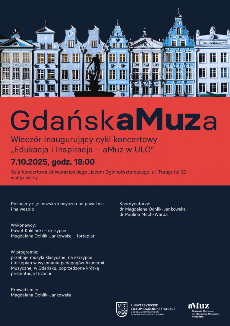 Zapraszamy na pierwszy koncert nowego cyklu wydarzeń artystyczno-edukacyjnych, realizowanych przez Akademię Muzyczną w Gdańsku w nowoczesnej sali koncertowej Uniwersyteckiego Liceum Ogólnokształcącego z Oddziałami Dwujęzycznymi im. Pawła Adamowicza w Gdańsku – szkoły, której aMuz jest dumnym patronem. Program cyklu będzie łączyć edukację z artyzmem, stając się okazją zarówno do muzycznej refleksji, jak i poznania tajników wykonawstwa „od kuchni”.