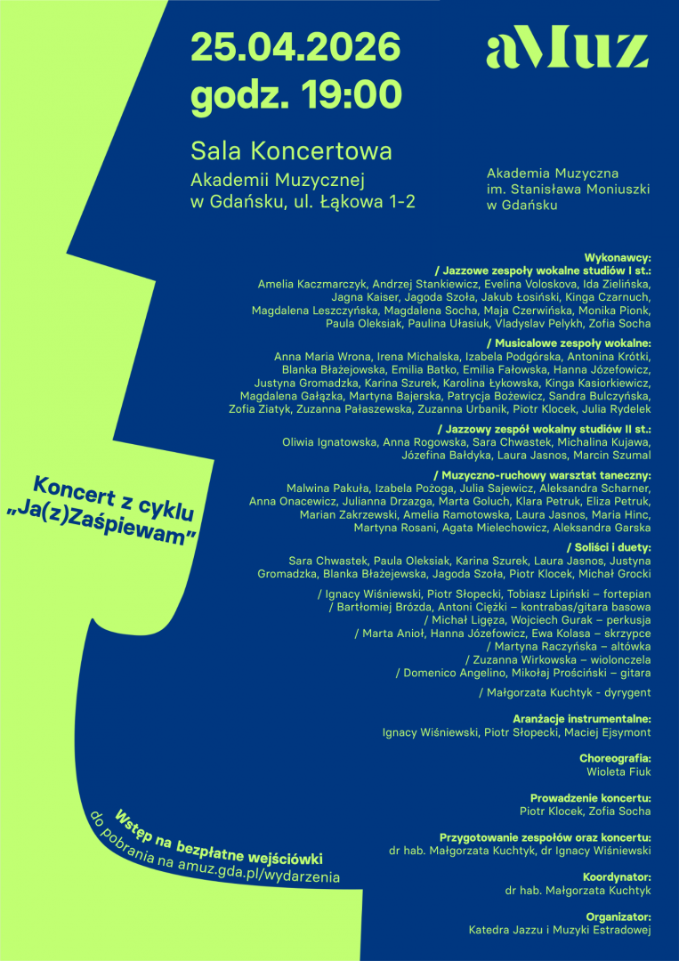 Będzie to wieczór pełen energii, emocji i wokalnych barw – koncert z cyklu Ja(z)Zaśpiewam ukaże szerokie spektrum możliwości artystycznych studentów specjalności wokalnych Akademii Muzycznej w Gdańsku. Podczas wydarzenia usłyszymy zarówno solistów, jak i zespoły, które zaprezentują repertuar jazzowy, musicalowy oraz muzyczno-ruchowy. Na scenie wystąpią: Jazzowe Zespoły Wokalne studiów I i II stopnia, Musicalowy Zespół Wokalny, Muzyczno-Ruchowy Warsztat Sceniczny, Dyrygencki Zespół Wokalny, soliści i zespół instrumentalny. Koncert będzie okazją do zaprezentowania różnorodnych stylistyk, umiejętności interpretacyjnych i scenicznych studentów.