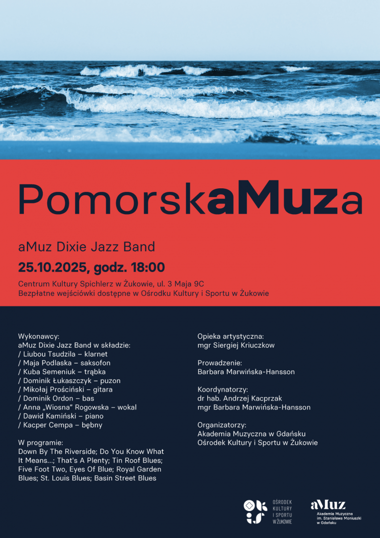 GdańskaMuza i PomorskaMuza to dwa cykle koncertowe Akademii Muzycznej w Gdańsku. Ich wspólnym celem jest prezentacja twórczości studentów i pedagogów nie tylko w przestrzeni akademickiej, lecz także w środowiskach o ograniczonym dostępie do kultury. Obie inicjatywy łączą misję edukacyjną z artystycznym przesłaniem, pokazując, że sztuka może być obecna wszędzie tam, gdzie istnieje pragnienie jej odbioru. Budują żywą więź między Akademią a społecznością, dając przestrzeń do spotkania, wzruszenia i wspólnego przeżywania piękna muzyki. Sezon artystyczny wydarzeń cyklicznych GdańskaMuza i PomorskaMuza otworzy w roku akademickim 2025/2026 koncert zespołu aMuz Dixie Jazz Band, złożonego ze studentów i absolwentów, specjalizującego się w jazzowym repertuarze z lat 20. i 30. XX wieku. Formacja prowadzona jest przez mgra Sergieja Kriuczkowa, który z pasją rozwija w młodych artystach miłość do jazzu i scenicznej improwizacji.