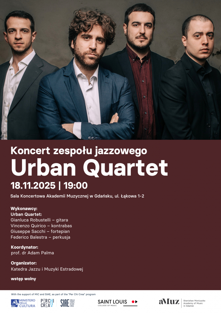 Katedra Jazzu i Muzyki Estradowej zaprasza na koncert, podczas którego wystąpi zespół Urban Quartet – nowoczesna formacja jazzowa prezentująca autorski repertuar oraz świeże spojrzenie na europejską scenę improwizowaną. Wydarzenie odbędzie się pod opieką artystyczną i koordynacją prof. Adama Palmy – wybitnego gitarzysty, pedagoga i promotora międzynarodowej wymiany artystycznej, którego działalność edukacyjna i koncertowa od lat wyznacza standardy współczesnego jazzu w Europie.