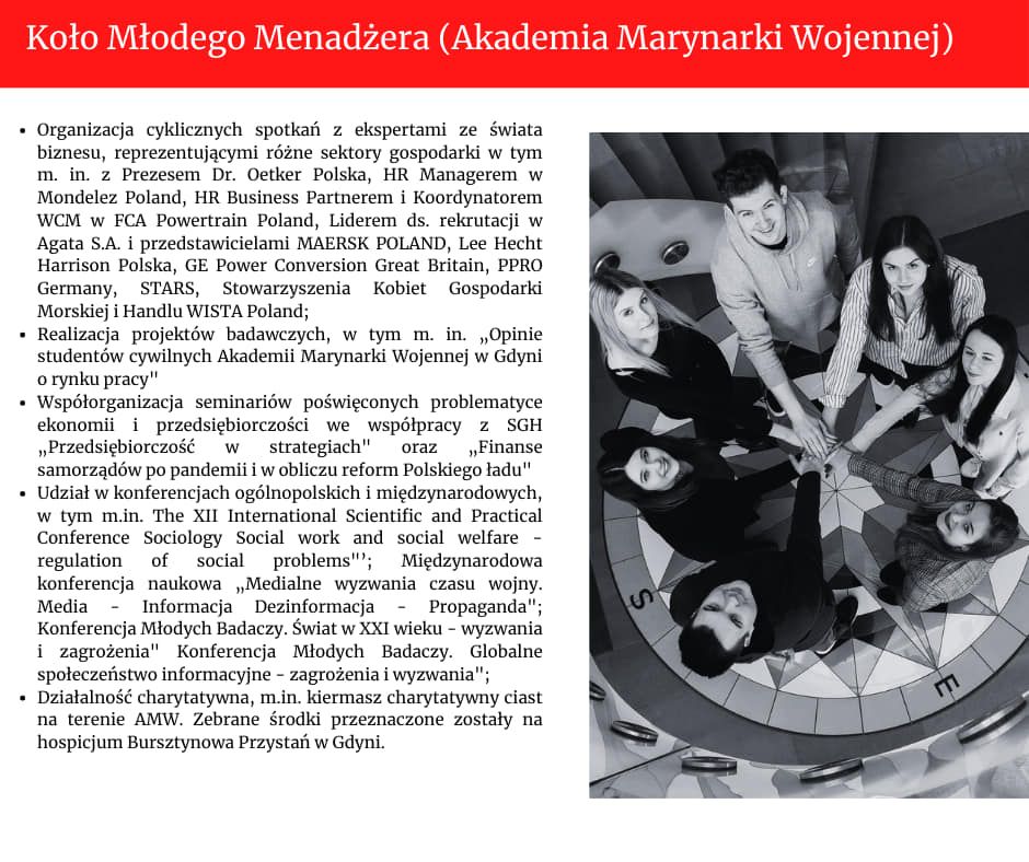 - Koło Naukowe Młodego Menadżera / Akademia Marynarki Wojennej im. Bohaterów Westerplatte w Gdyni
