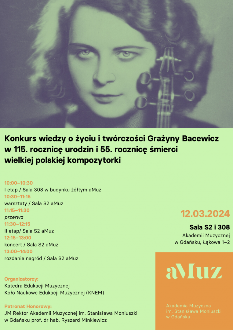 Konkurs wiedzy o życiu i twórczości Grażyny Bacewicz pod honorowym patronatem Jego Magnificencji Rektora Akademii Muzycznej im. Stanisława Moniuszki w Gdańsku prof. dra hab. Ryszarda Minkiewicza.