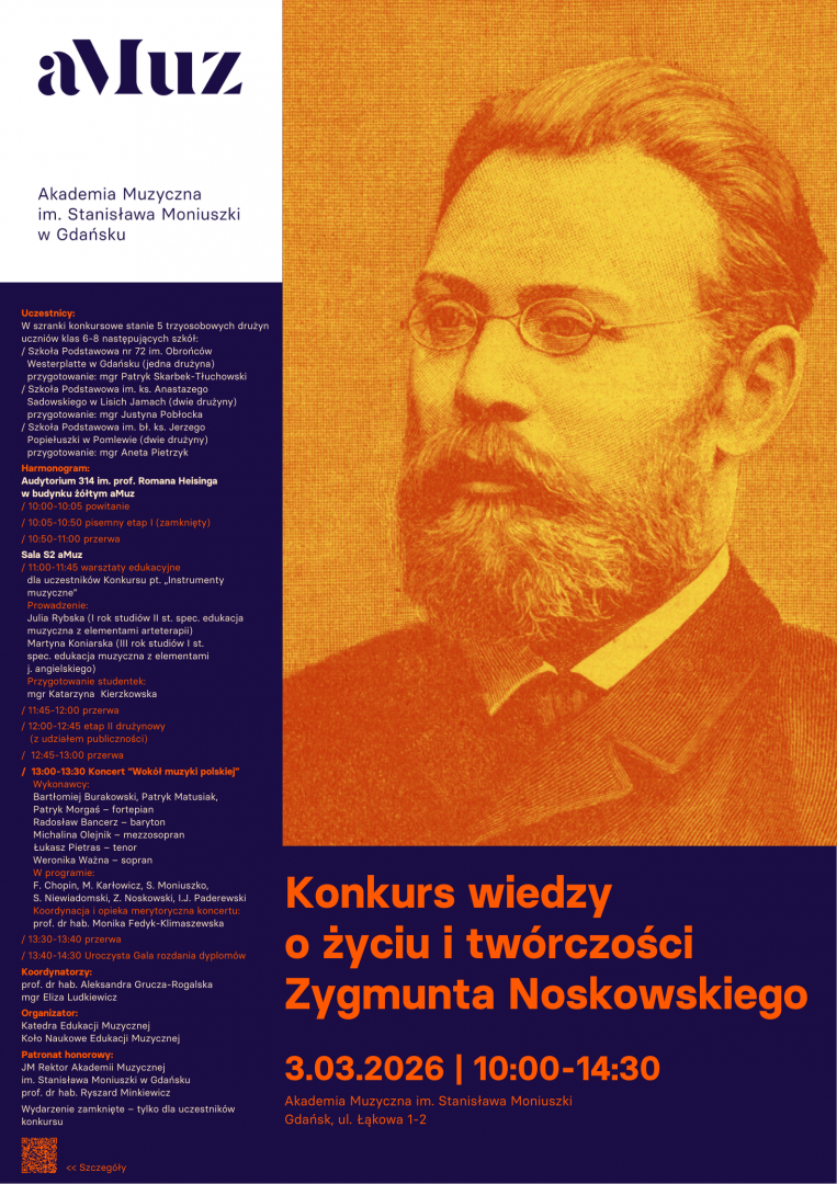 Konkurs z okazji 180. rocznicy urodzin Zygmunta Noskowskiego – wybitnego kompozytora, pedagoga i dyrygenta (1846–1909) – skierowany jest do uczniów szkół podstawowych regionu pomorskiego. Celem wydarzenia jest upowszechnianie wiedzy o dorobku jednego z ojców polskiej symfoniki oraz inspirowanie młodzieży do odkrywania dziedzictwa narodowego. Konkursowi towarzyszyć będą działania edukacyjne, promujące postać i twórczość Z. Noskowskiego, a także spotkania integrujące środowisko uczniowskie i nauczycielskie.