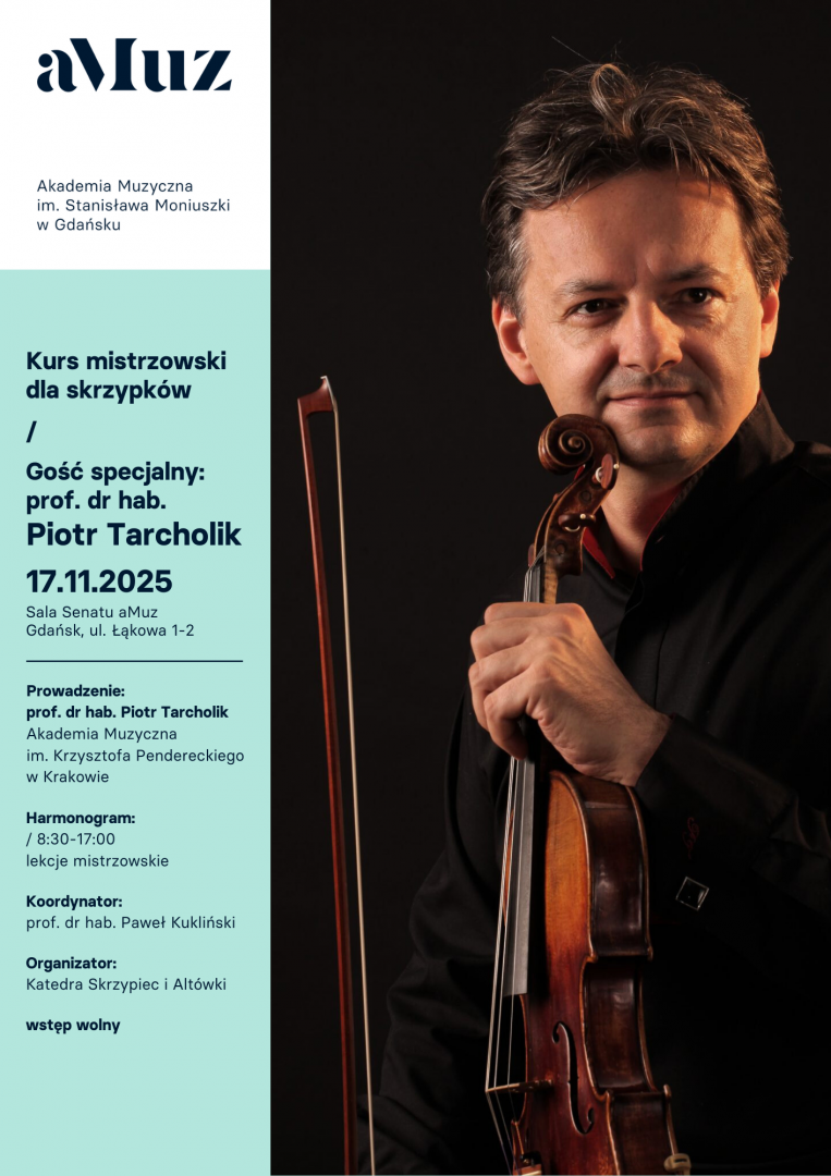 Kurs prowadzony przez prof. dra hab. Piotra Tarcholika (Akademia Muzyczna im. Krzysztofa Pendereckiego w Krakowie) – wybitnego skrzypka, koncertmistrza i pedagoga, znanego z mistrzowskich interpretacji dzieł symfonicznych i kameralnych oraz wieloletniej działalności dydaktycznej – stanowi okazję do intensywnej pracy artystycznej z jednym z najwybitniejszych przedstawicieli współczesnej polskiej szkoły skrzypcowej. Wydarzenie adresowane jest do studentów oraz uczniów szkół muzycznych II stopnia.