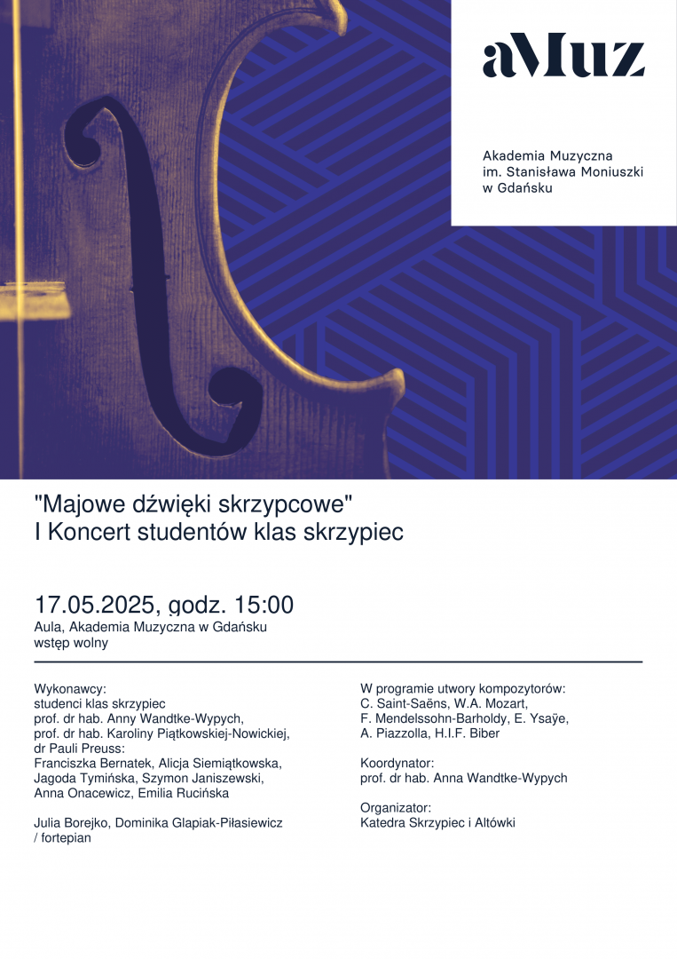studenci klas skrzypiec prof. dr hab. Anny Wandtke-Wypych, prof. dr hab. Karoliny Piątkowskiej-Nowickiej, dr Pauli Preuss: