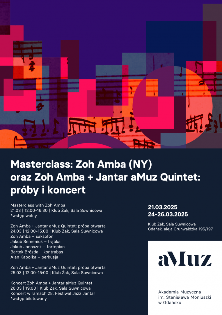 Na Festiwalu Jazz Jantar Zoh Amba wystąpi w podwójnej roli – odegra solowy koncert w Galerii Żak, a także stanie na czele nowego, edukacyjnego projektu. Jako liderka powołanego do życia specjalnie na ten jeden koncert Zoh Amba Jantar aMuz Quintet przeprowadzi warsztaty ze studentami Akademii Muzycznej im. Stanisława Moniuszki w Gdańsku, a następnie z czterema z nich wystąpi na scenie Sali Suwnicowej.