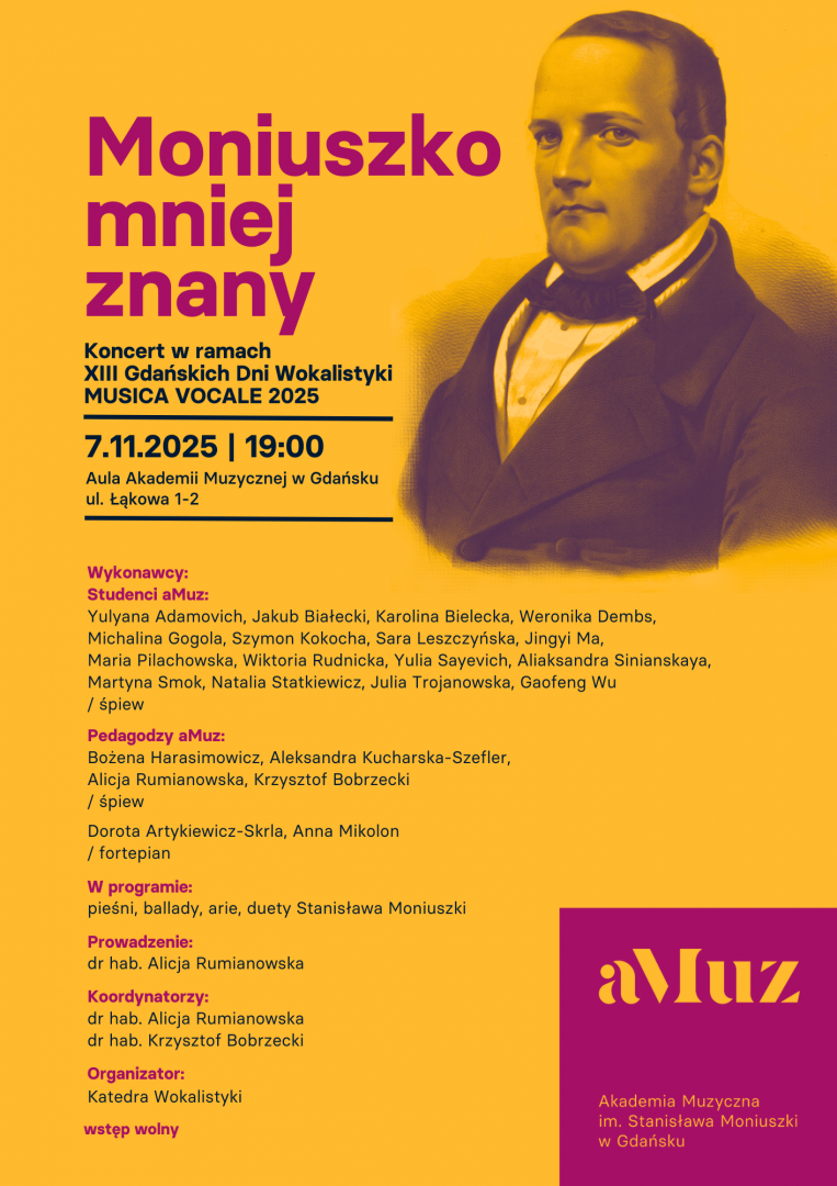 Zapraszamy na wieczór poświęcony mniej znanym dziełom patrona naszej uczelni – Stanisława Moniuszki. Program koncertu przybliży słuchaczom pieśni, arie i miniatury sceniczne, które rzadziej goszczą na estradach koncertowych, mimo to ukazują nie tylko kunszt kompozytorski, lecz i bogactwo emocji, subtelność liryki oraz nieprzemijające piękno melodii, charakterystyczne dla twórczości autora Halki i Strasznego dworu. Wystąpią studenci i pedagodzy Katedry Wokalistyki Wydziału III Wokalno-Aktorskiego, prezentując utwory, które – choć mniej znane – pozostają prawdziwymi perłami polskiego romantyzmu wokalnego.