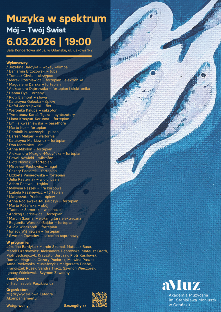 Koncert promujący płytę „Muzyka w spektrum”, zawierającą miniatury instrumentalne dedykowane osobom ze spektrum autyzmu. Album powstał przy zaangażowaniu pedagogów i studentów aMuz i stanowi pionierskie przedsięwzięcie na skalę światową – muzyka na płycie służy stymulacji, wyciszeniu i terapeutycznej obecności dźwięku. Na scenie zaprezentują się pianiści Międzywydziałowej Katedry Akompaniamentu we współpracy z wykładowcami i studentami Wydziału Instrumentalnego oraz Katedry Jazzu i Muzyki Estradowej.