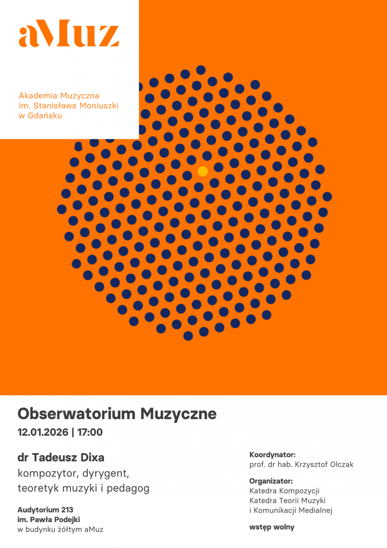 Styczniowym gościem specjalnym Obserwatorium Muzycznego będzie dr Tadeusz Dixa – znakomity kompozytor, dyrygent, teoretyk muzyki i pedagog, którego dzieła znajdują trwałe miejsce w repertuarze koncertowym. Spotkanie poświęcone będzie jego sylwetce artystycznej, refleksji nad drogą twórczą oraz analizie wybranych utworów, stanowiących świadectwo indywidualnego języka muzycznego i głębokiego namysłu nad formą i ekspresją. Wydarzenie poprowadzi prof. dr hab. Krzysztof Olczak – kompozytor i kierownik Katedry Kompozycji, który w rozmowie z gościem przybliży uczestnikom konteksty powstawania dzieł, inspiracje oraz perspektywy współczesnego twórcy funkcjonującego w dialogu z tradycją i nowoczesnością.