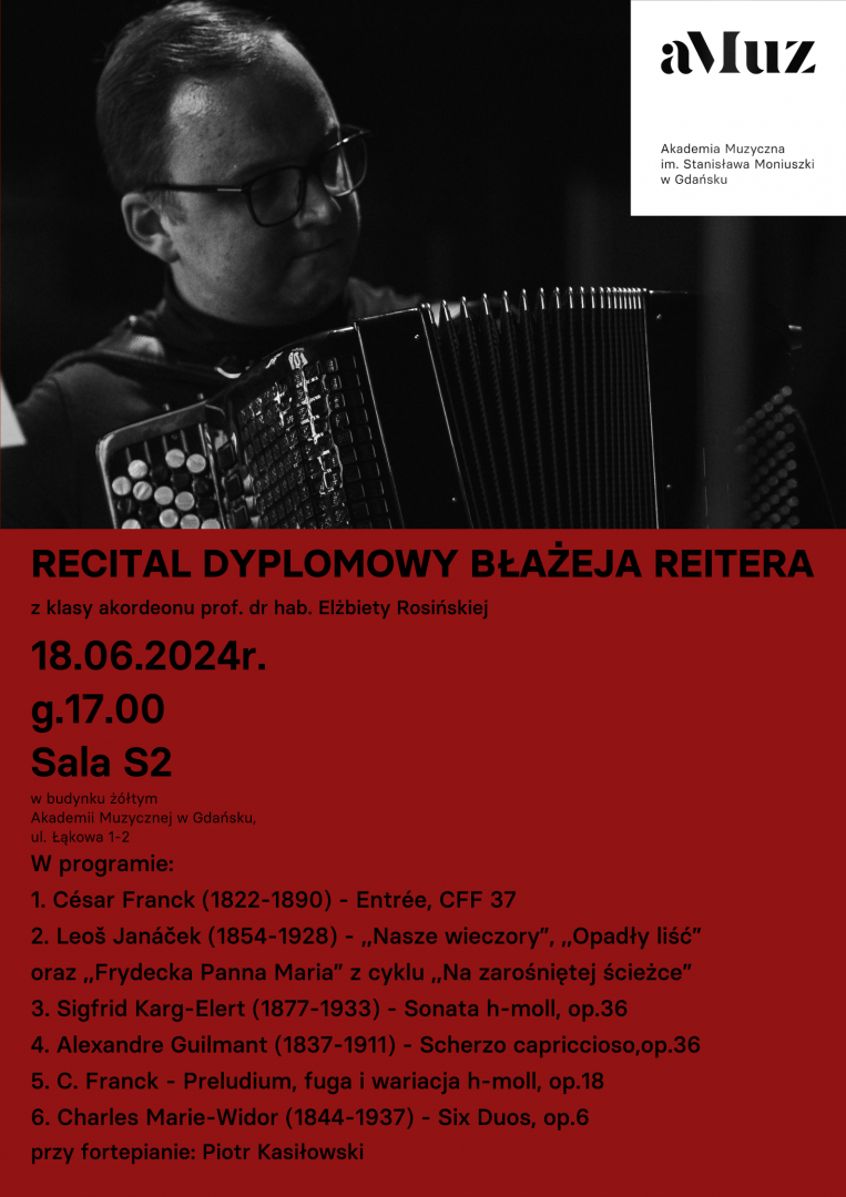 Plakat wydarzenia Recital dyplomowy Błażeja Reitera - akordeon (studia II st.)