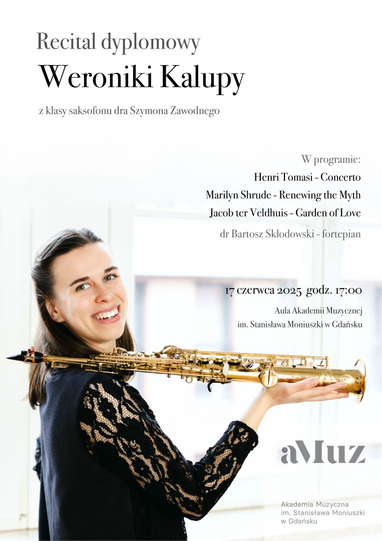 Plakat wydarzenia Recital dyplomowy Weroniki Kalupy - saksofon (studia I st.)
