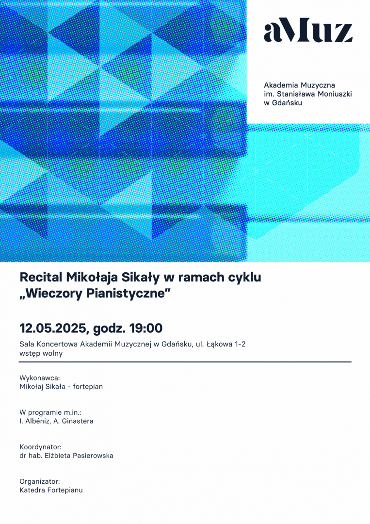 w Katedrze Fortepianu macierzystej Uczelni. Jest również absolwentem klasy fortepianu PSM I i II stopnia w Gdańsku-Wrzeszczu, gdzie kształcił się pod kierunkiem mgr Alicji Michowskiej oraz mgr Małgorzaty Stożyńskiej.