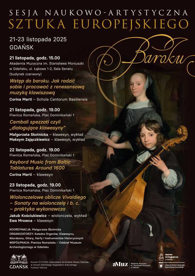 Projekt poświęcony muzyce europejskiego baroku stwarza wyjątkową okazję do obcowania z bogactwem stylów, form i ekspresji, które współtworzyły muzyczną tożsamość tej epoki. Zajęcia i prezentacje artystyczne obejmują wykonawstwo na instrumentach historycznych oraz świadomą, pogłębioną interpretację dzieł dawnych mistrzów. Uczestnicy projektu zgłębiają idiom barokowy, uczą się autentycznego stylu wykonawczego i rozwijają historyczno-muzyczną wrażliwość, pracując pod okiem wybitnych specjalistów w dziedzinie muzyki dawnej. Gośćmi tegorocznej edycji będą: Corina Marti, Ewa Mrowca, Jakub Kościukiewicz, Anna Swoboda oraz Anna Zawisza – artyści i pedagodzy o międzynarodowym doświadczeniu, których wiedza i pasja stanowić będą inspirację do głębokiej pracy artystycznej.