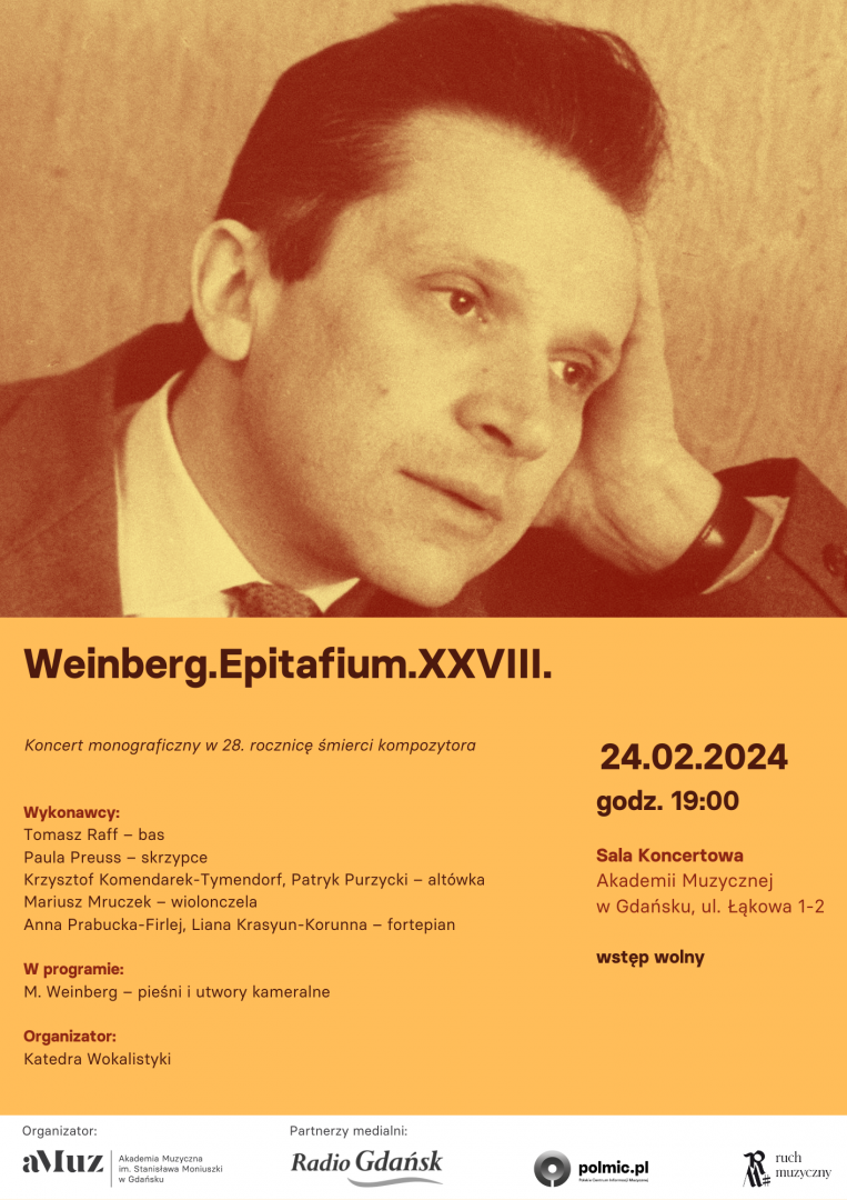 Serdecznie zapraszam na koncert Weinberg.Epitafium.XXVIII. Będzie to monograficzne wydarzenie poświęcone twórczości kameralnej i wokalnej Mieczysława Weinberga z okazji 28. rocznicy odejścia kompozytora. Podczas koncertu zabrzmią cykle pieśni „Z liryki” W. Żukowskiego op. 116 i „Z liryki” A. Feta op. 134 – będą to pierwsze polskie wykonania tych cykli. Ponadto w programie: Sonata na altówkę i fortepian op. 28 i Trio smyczkowe op. 48. Wśród wykonawców są artyści, pedagodzy i profesorowie związani z aMuz.