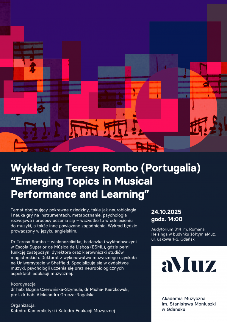 Nowe kierunki w wykonawstwie muzycznym i uczeniu się muzyki, obejmujący pokrewne dziedziny, takie jak neurobiologia i nauka gry na instrumentach, metapoznanie, psychologia rozwojowa i procesy uczenia się – wszystko to w odniesieniu do muzyki, a także inne powiązane zagadnienia. Wykład będzie prowadzony w języku angielskim.