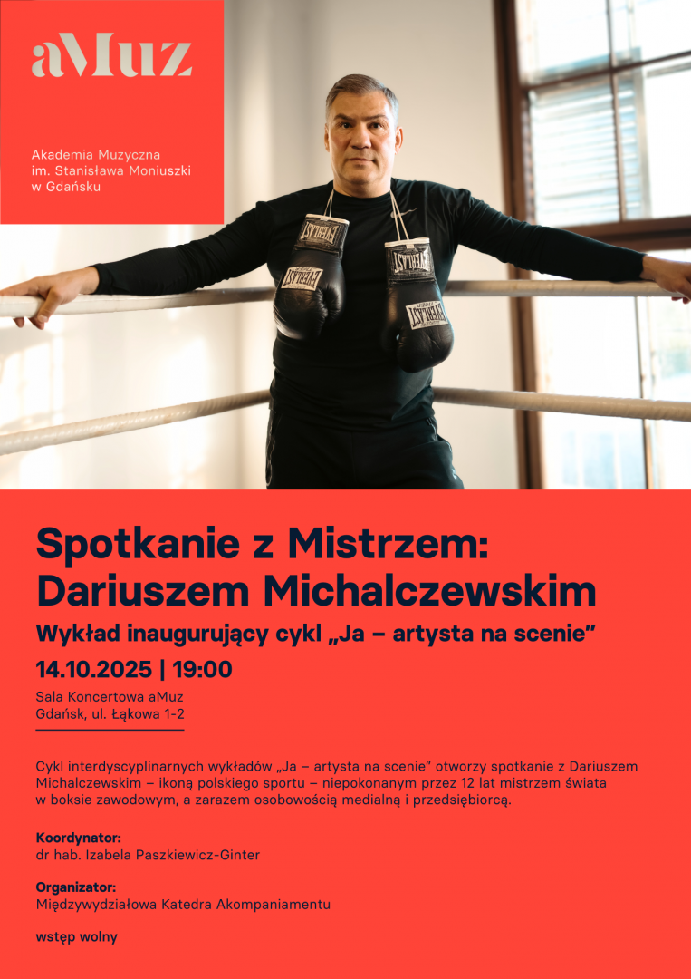 Cykl interdyscyplinarnych wykładów Ja – artysta na scenie otworzy spotkanie z Dariuszem Michalczewskim – ikoną polskiego sportu, niepokonanym przez 12 lat mistrzem świata w boksie zawodowym, a zarazem osobowością medialną i przedsiębiorcą. Celem cyklu jest konfrontacja doświadczeń artystów scenicznych, sportowców i lekarzy – środowisk, które na co dzień mierzą się z presją występu, ekspozycją ciała i emocji oraz potrzebą twórczego radzenia sobie ze stresem. Spotkania poprowadzą uznani przedstawiciele świata kultury, medycyny i sportu. Ich formuła zakłada rozmowę, refleksję i inspirację.
